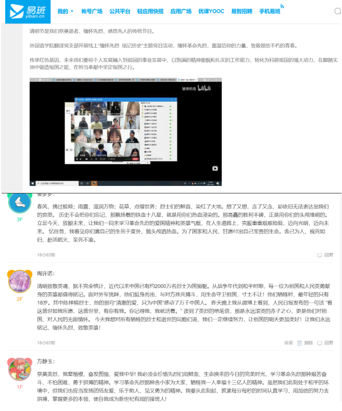 各位学生党员各抒己见,线上分享交流了心得。2017级学生党员赵子悦同志在发言中动情地说道:“世界上哪有什么岁月静好,只不过是有人替你负重前行。中华大地,无数革命先烈,仁人志士,为了人民的幸福、民族的解放和国家的富强,在战场上英勇战斗,直到流尽最后一滴血,永远长眠在咱们脚下的这片热土上。我们的幸福生活是他们的鲜血换来的,缅怀先烈,致敬英雄!强我中华,吾辈自强! ”2018级学生党员方瑶瑶同志分享道:“没有先烈的付出,就没有今天的中国,为了一个强大的中国,他们付出了太多,今天在面对复杂的国际国内环境,新时代的中国人应该像革命先烈一样,保卫和平,守住我们的江山。”之后,其他学生党员在外国语学院易班微社区官方平台上分享了自己的心得。