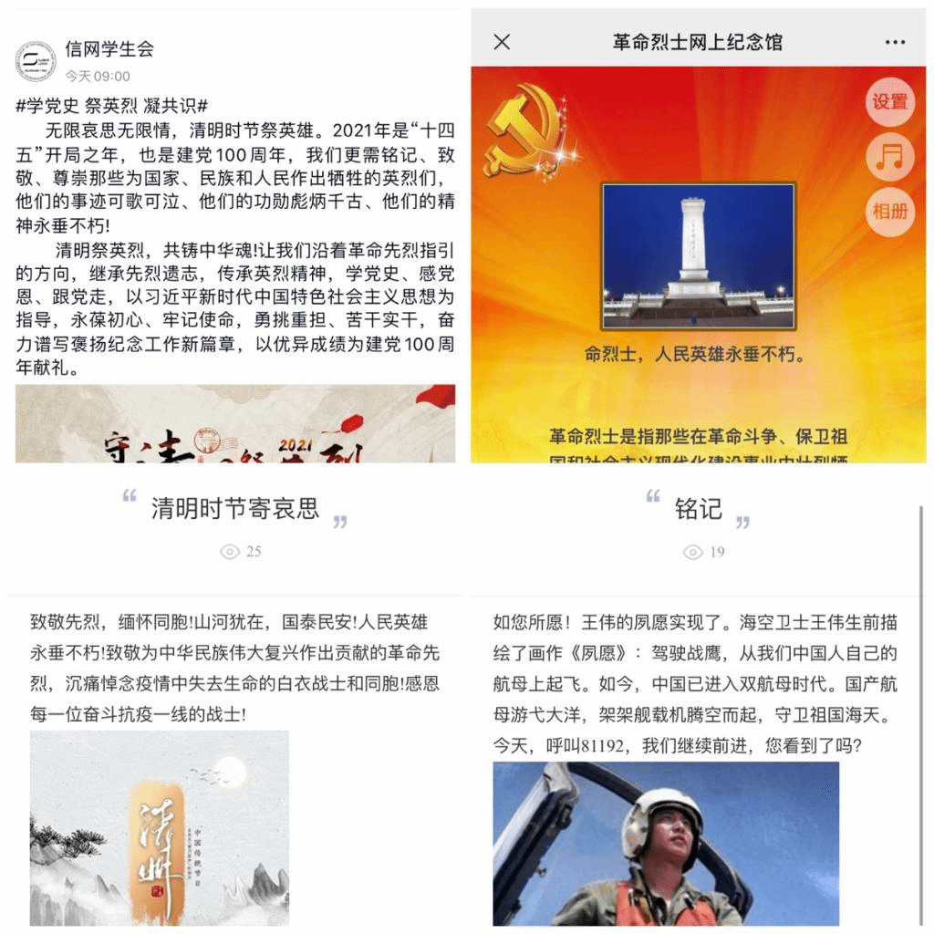 线上通过在易班微社区、QQ、微信等网络平台,发布致敬英烈相关的内容,分享英烈生平事迹,表达对英烈的崇敬之情。在烛光会微信公众号平台,开展网上祭扫活动,通过“献花”“点烛”“上香”等方式表达了对先烈的怀念与敬仰,在特殊时期给了同学们一个向英烈表达致敬的机会,激发了同学们的爱国热情,更用文明科学的方式的倡导了“移风易俗 文明祭祀”的新理念。
