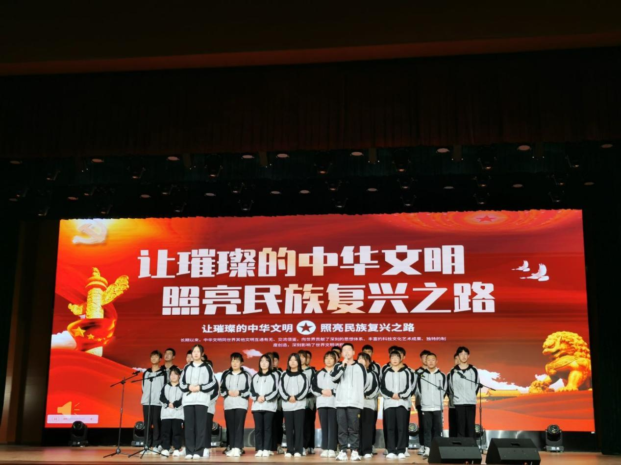 晚会接近尾声时,师生共同演唱《我和我的祖国》,“我和我的祖国,一刻也不能分割,无论我走到哪里,都流出一首赞歌……”,在指导老师的领唱下,全场六百余名学生齐声合唱,他们挥动自己的双手,脸上洋溢着灿烂的笑容,整个大礼堂变成了歌唱的海洋,将现场气氛引向高潮。