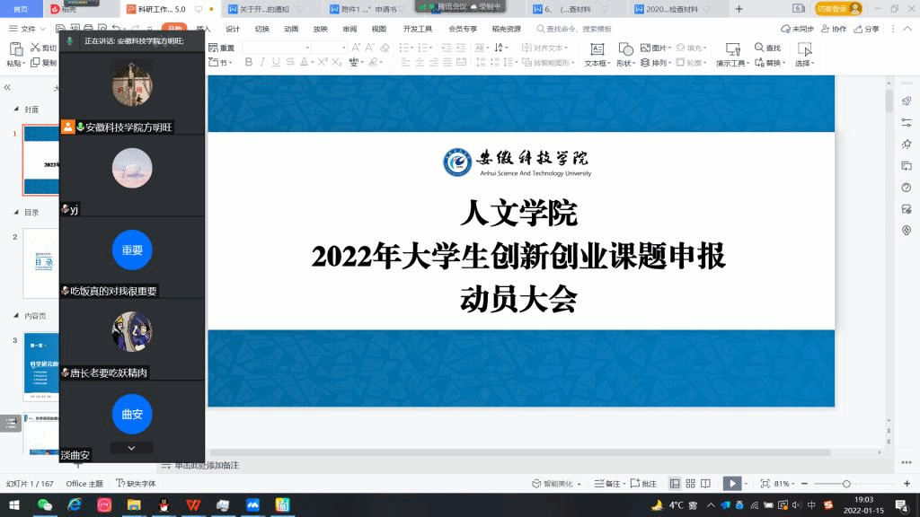 为进一步推动大学生创新创业训练计划落到实处,培养学生创新创业实践能力,1月16日晚,人文学院利用腾讯会议平台召开线上动员大会,19至21级部分同学参加了会议,会议由方明旺主持。
