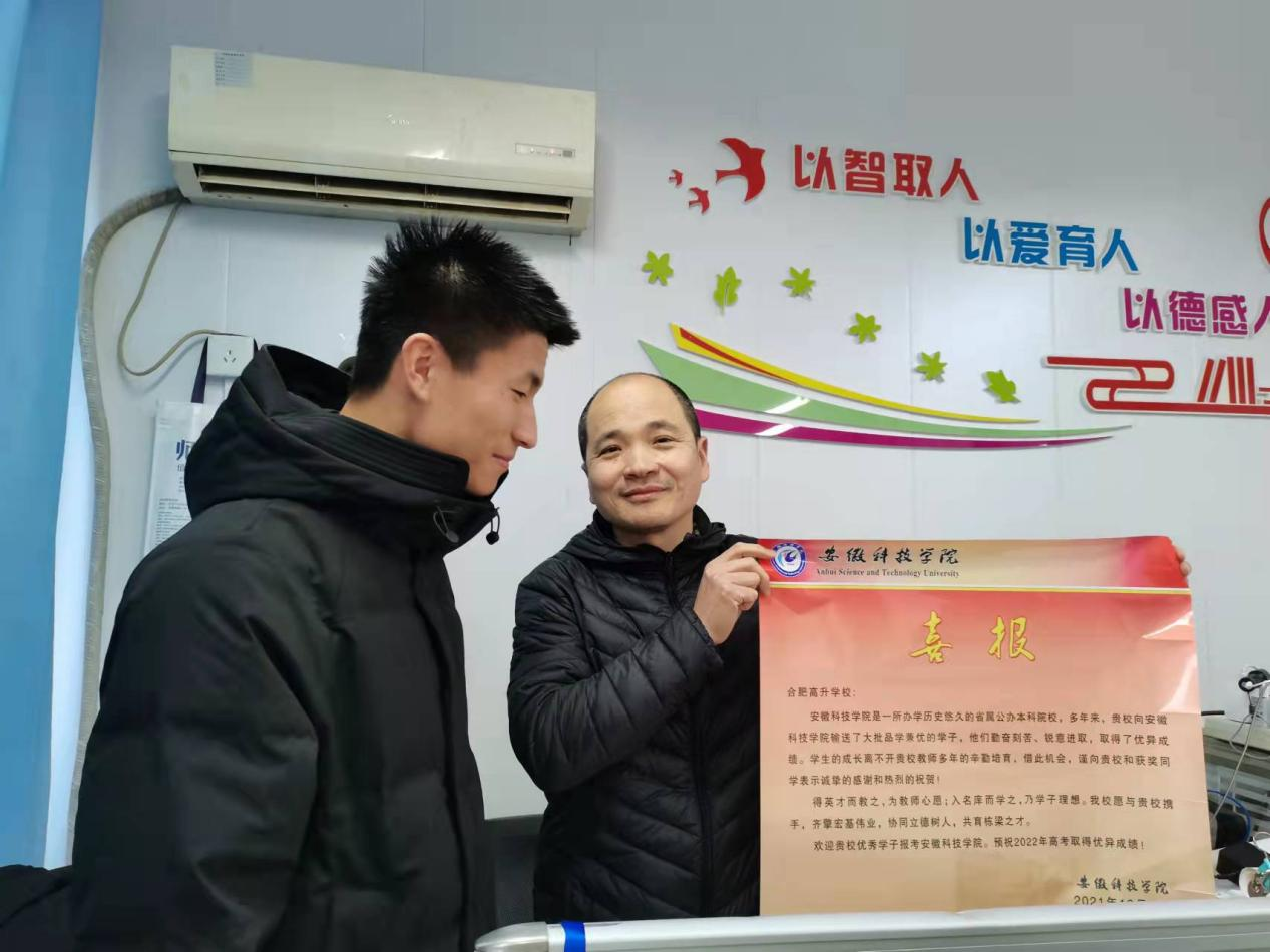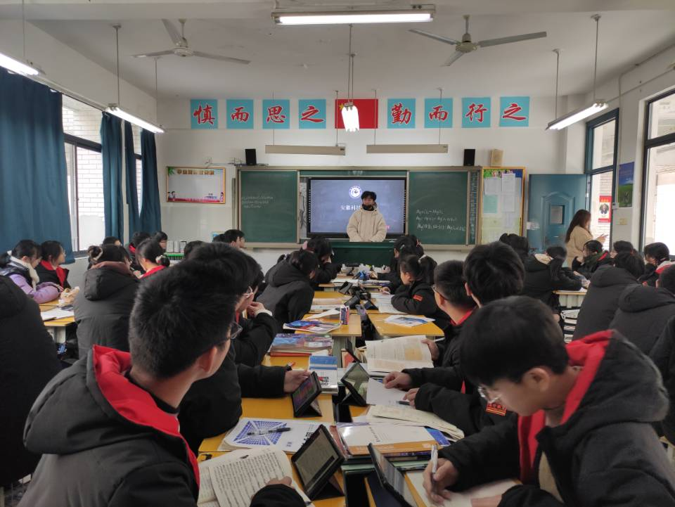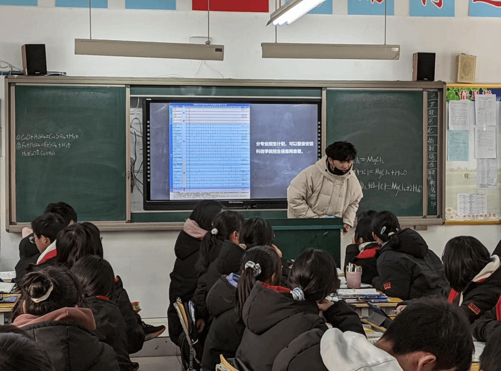 刘志伟团队首先拜访了语文老师王雪莲和英语老师宋梦琼,并与老师进行了交谈。交谈过程中,共同回忆了高中生活的点点滴滴。他向老师汇报了这几个月在大学生活和学习上的变化与成长,向老师展示了在学院参加活动时的照片等。并向老师详细介绍了安徽科技学院的相关情况如学校条件、校园风景、师资水平、考研录取率等。合肥高升学校的年级主任、数学老师宋仔义,听说团队此行的目的之后,热情地安排了刘志伟团队与高三学子进行互动交流。