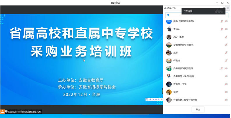 12月8日至9日,由安徽省教育厅主办的全省教育系统招标采购业务培训会在合肥召开,根据疫情防控有关要求,培训采取线上线下相结合的方式开展。省教育厅监审处领导、省属高校采购部门负责人、厅属中专学校分管校领导及招标采购工作人员共100余人参加了会议。我校国有资产管理处处长郑亚辉、副处长窦鹏、招标采购办公室副主任黄福东和秘书李香云等四人参加会议,郑亚辉应邀作为六所典型高校代表之一在培训会上就我校招标采购工作做经验交流发言。
