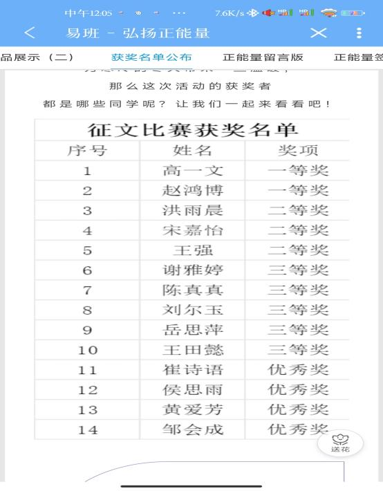 本次活动收到作品45篇。文章中,同学们围绕父母、朋友、同学、老师以及陌生人的正能量行为带给他们的深刻触动、给予他们的精神鼓励,用细腻的笔触表达了自己感受到的正能量。在《父母是最强的正能量》一文中,作者将父母比作执灯的人,默默无声却给自己带来无限光明;在《弘扬正能量 安科正青春》一文中,作者描写了校园里发生的一件温暖的小事呈现出的社会正能量和对自己的触动;在《美在身边》一文中,作者分享了自己在迷茫时收到的来自保洁阿姨的关心与关怀。