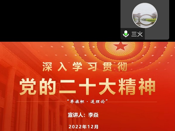 为深入学习宣传贯彻党的二十大精神,提升学生干部的政治素养和思想水平,坚定理想信念,12月28日下午,校辅导员理论宣讲团成员、动物科学学院党政办公室主任、团委书记李焱利用线上平台,为该学院学生党员和团学干部开展了以“奋进新征程 建功新时代”为主题的党的二十大精神理论宣讲。