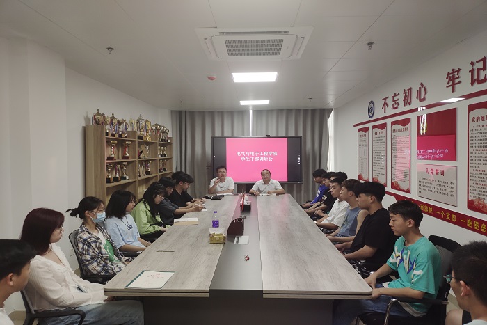 5月18日晚,电气与电子工程学院于西辅楼308召开学生干部调研会。学院党委副书记、纪委书记尚磊,团委副书记、学生会指导老师于宏亮出席会议,学生代表参加会议,会议由于宏亮主持。