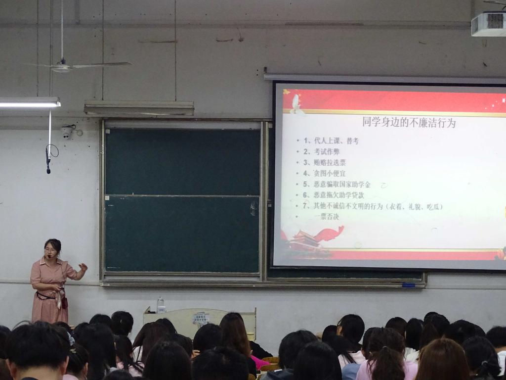 讲座由学院党委副书记李沙娜主讲。李沙娜以“何为廉”“何由廉”“何以廉”三个问题贯穿始终,通过历史人物廉洁故事为切入点引入同学日常生活存在的廉洁问题,提醒并教育同学在面对人生道路的各种压力和诱惑时,要牢守初心,树立并坚守正确的世界观、人生观、价值观。最后,李沙娜要求各同学要以“祸患常积于忽微”之心对待小事、小节、小利,时刻自重、自省、自警、自励,慎独慎微慎终如始。坚守自律与他律,勤学笃行,踏实肯干,主动担当。