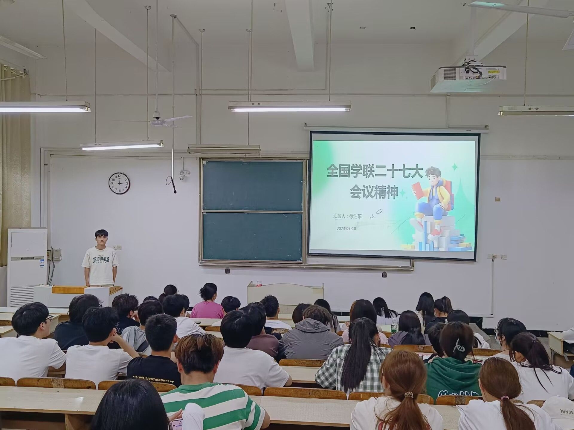 徐浩东从全国学联二十七大的背景和意义、主要内容与精神、青年学生责任与担当以及总结反思展望未来四个方面带领同学们学习领悟全国学联二十七大的会议精神。他表示,学习全国学联二十七大会议精神有助于进一步明确了学生工作的方向和目标,提出了新的工作思路和举措,对推动学院学生会学生工作的开展也具有重要意义。学院学生会成员要树立正确的价值观导向、积极参与社会实践活动,注重服务广大学生,积极维护学生权益。要注重创新和发展,积极探索新的工作模式和方法,从而更好地履行职责和使命。