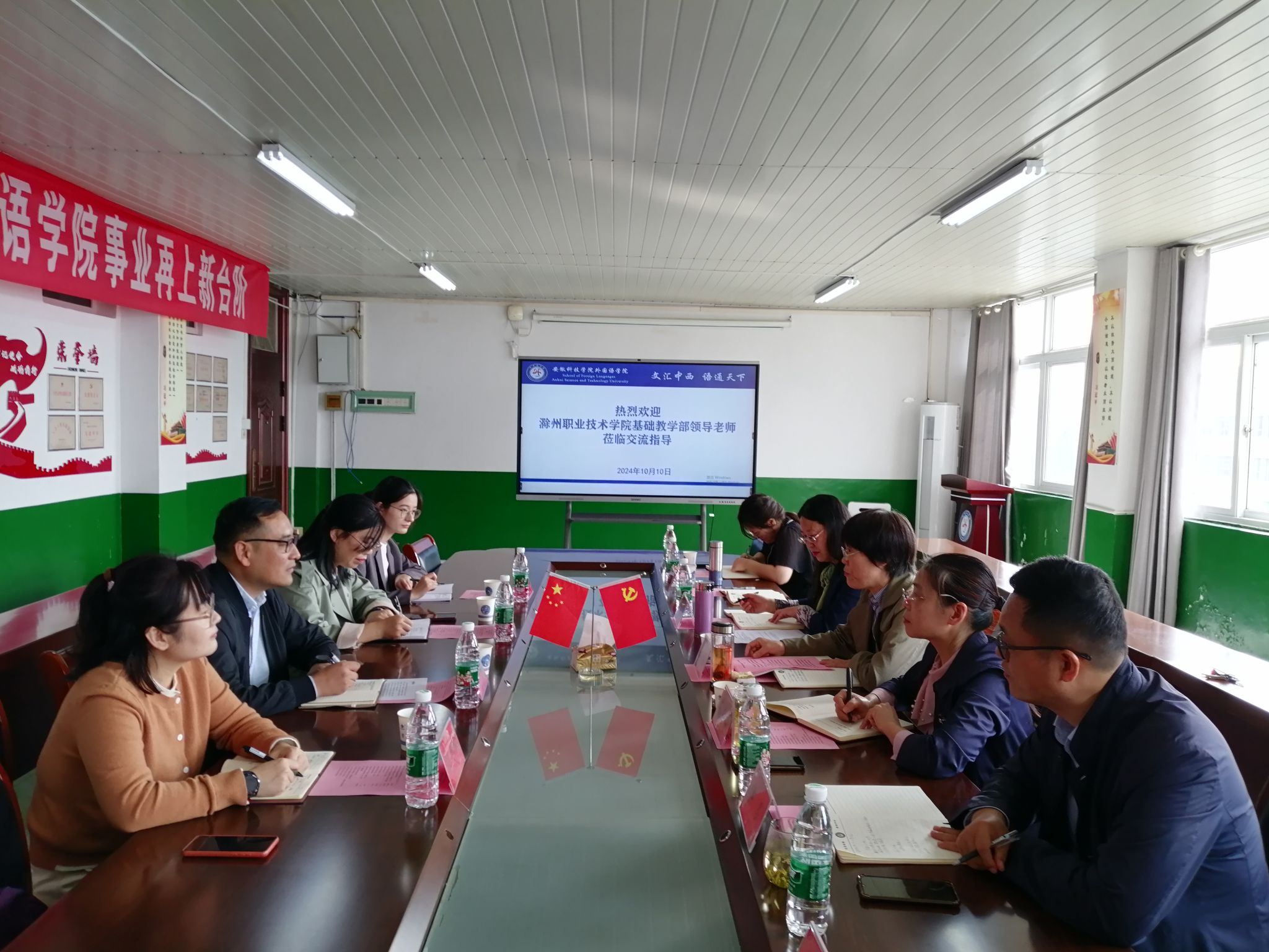 10月10日上午,滁州职业技术学院基础教学部副主任(主持工作)刘杰一行4人前来外国语学院就“大学外语课程教学与教科研建设”开展交流活动。外国语学院党政领导和教师代表参加座谈会。座谈会由学院党委书记蔡为青主持。