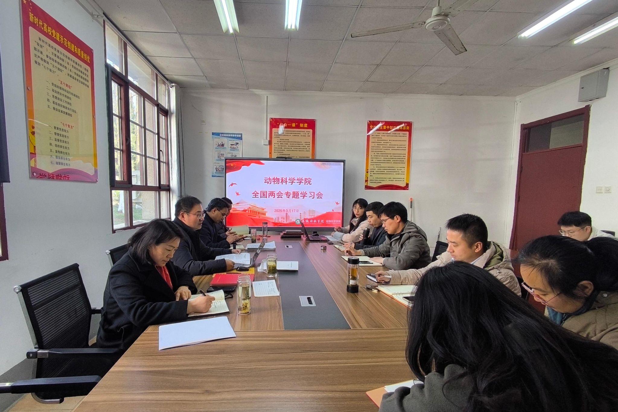 为深入学习贯彻2025年全国两会精神,3月18日下午,动物科学学院在学院会议室召开全国两会精神专题学习研讨会,会议由党委书记甘宗平主持,学院党委理论学习中心组成员、各党支部书记、系(室)主任参加学习。