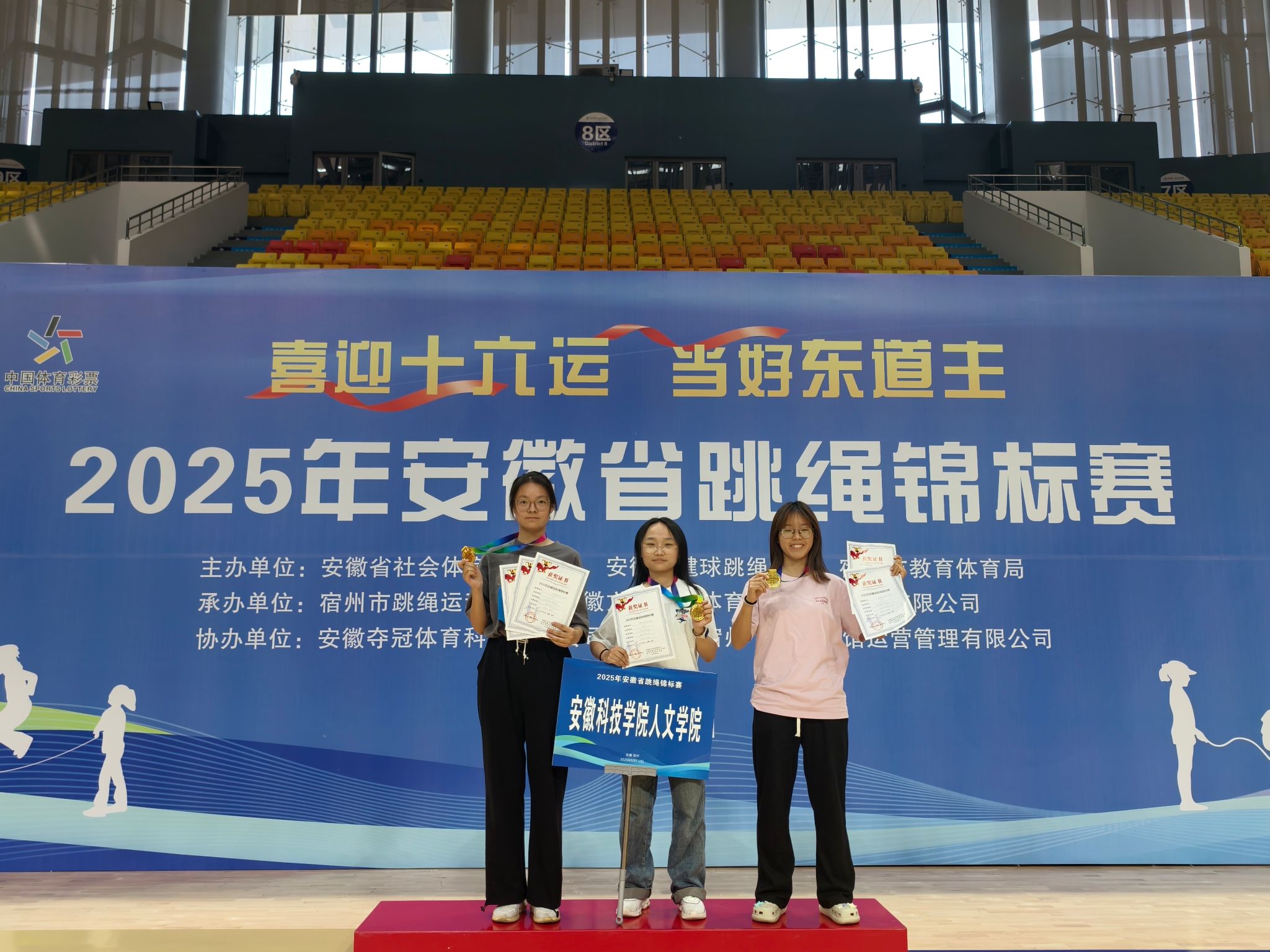 6月1日至2日,2025年安徽省跳绳锦标赛在宿州市体育馆举行。安徽省跳绳锦标赛是省内项目设置最全、覆盖人群最广、参赛规模最大的省级跳绳品牌赛事。本次比赛吸引了来自全省的50余支队伍近800名运动员参赛。经过激烈角逐,由人文学院3名学生组成的安徽科技学院代表队发挥出色、表现卓越,法学243班陈缘包揽青年女子组30秒单摇跳、3分钟单摇跳、30秒间隔交叉直摇跳3项冠军;汉语言文学232班李梦雨荣获30秒单摇跳第六名、3分钟单摇跳第五名;法学243班陈梦羽获得3分钟单摇跳第八名。