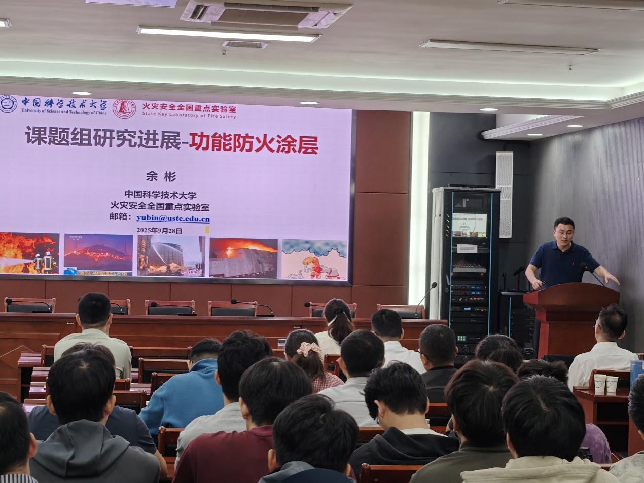 报告中,余彬教授以“功能防火涂层”为主题,深入阐述了功能防火涂层在可燃性基材表面的应用,及其燃烧时产生的炭层可阻隔热量、氧气与未被燃烧部分的材料接触,提高基材耐火极限的作用。同时,还介绍了团队一系列高性能、多功能阻燃纳米涂层的最新成果,以及这些成果在有效抑制木材、聚氨酯泡沫等易燃材料的热释放与火蔓延,解决传统防火涂料所遇难题方面展现出良好的应用前景。现场师生与余彬教授还就相关学术问题进行了热烈交流与探讨。