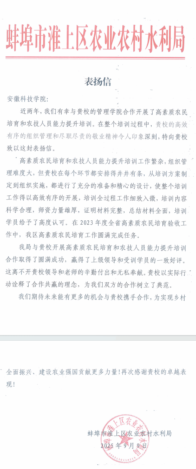 近日,蚌埠市淮上区农业农村水利局发来表扬信,对我校管理学院在高素质农民培育和农技人员能力提升工作中的出色表现给予高度评价。管理学院在多次合作中充分发挥学科与人才优势,针对基层实际需求,精准设计培训课程体系,涵盖农业技术推广、现代农业经营管理等重点领域。学院选派经验丰富教师团队,采用案例教学、实地观摩和实操训练等多种形式,精心组织培训各环节,确保培训内容科学实用、教学过程规范有序。