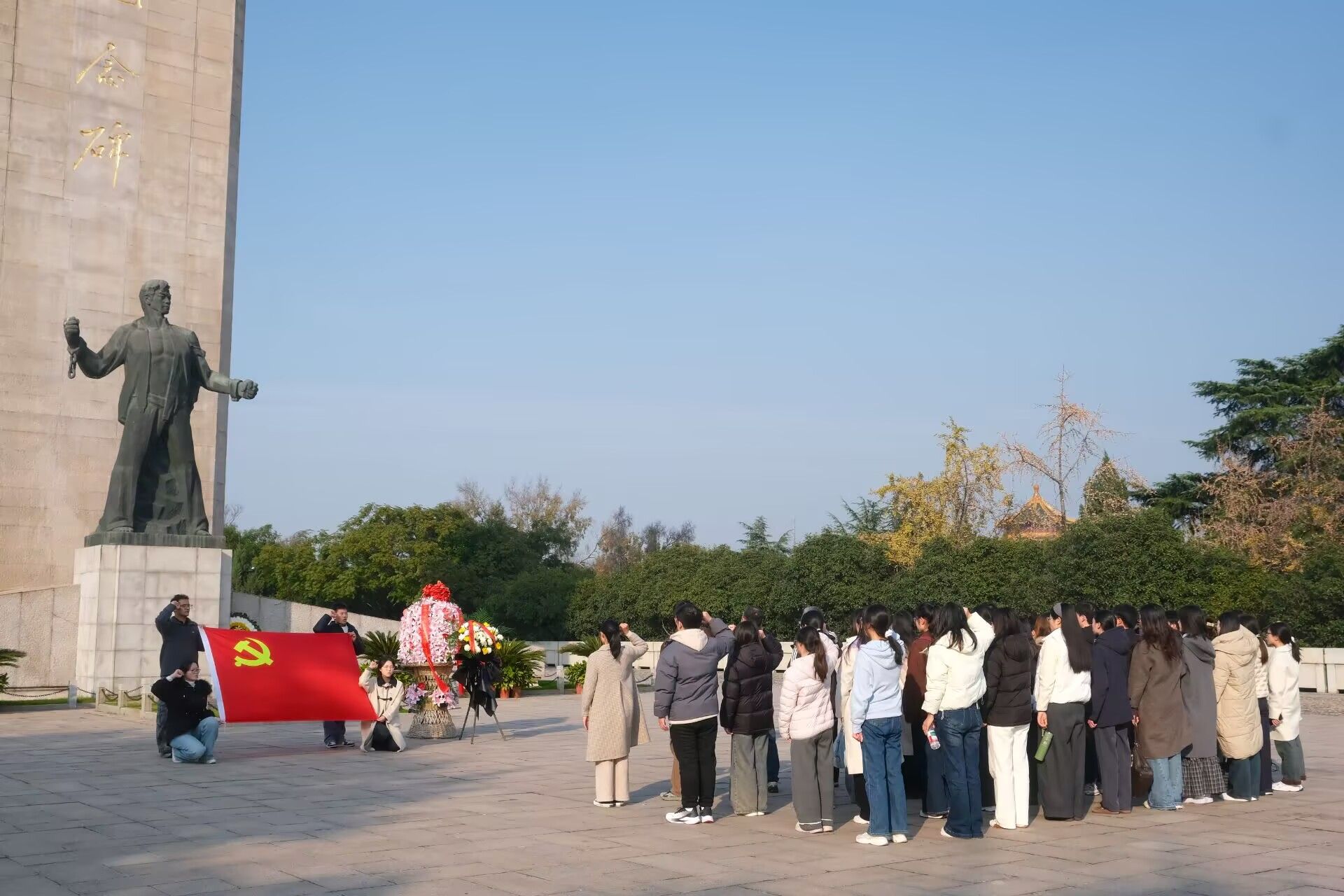 在巍然矗立的雨花台烈士纪念碑前,学生党员代表缓步上前,向革命烈士敬献花篮,全体师生党员列队肃立、鞠躬致哀,深切缅怀革命先烈们的丰功伟绩与崇高精神。在雨花台烈士纪念碑广场正中央,全体师生党员面向鲜红的中国共产党党旗,高举右拳、重温入党誓词。誓言铿锵有力、掷地有声,表达了对革命先烈的无限崇敬,彰显了每一位党员不忘初心、牢记使命,决心为党和人民的事业矢志奋斗终身的坚定信念与使命担当。