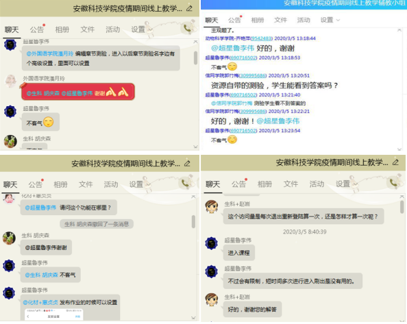 联管联控,确保质量。为确保线上教学工作有效、有序、保质、保量开展,学校印发《安徽科技学院2019-2020学年第二学期线上教学质量监控与督导工作实施方案》,建立健全线上教学督导评价机制,加强对线上教学各环节的质量监控,强化教学督导工作的督教、督学、督管职能,确保线上教学期间教学秩序运行平稳,实现与线下教学质量的实质等效。3月2日,学校处级以上干部线上听课60余节,提出整改建议80余条。学校教学督导定向联系,每个督导督查了解一个教学院(部),每周督查不少于3门线上课程教学情况。教学院(部)教学督导员督查本学院一个专业,每周不少于2门线上课程教学情况,重点督查老师线上教学准备和开展情况、学生线上学习情况等。