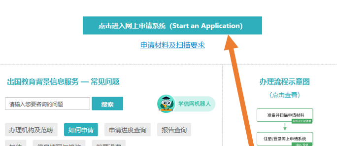 4、点击“点击进入网上申请系统(Start an Application)”按钮,按步骤操作,生成“中国高等教育学历认证报告”。
