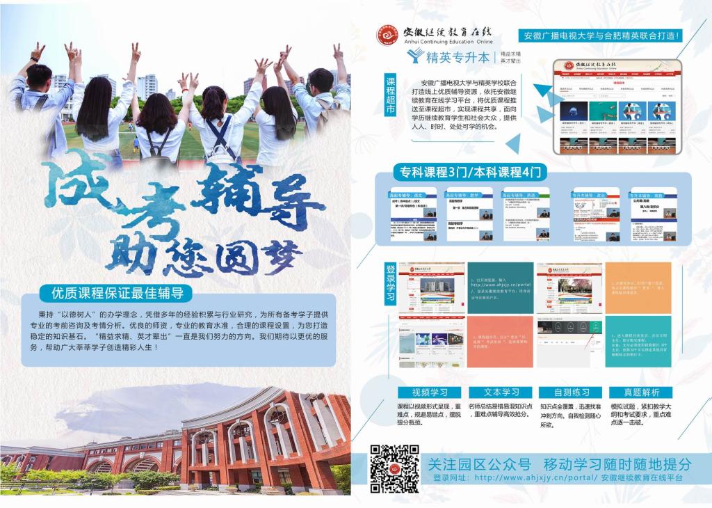 为满足成考考生考前辅导需求,安徽继续教育在线平台课程超市在2019年推出了一系列成考辅导课程,该系列课程自推出至今,社会反响较好。请有意参加在线辅导的学员按照附件操作指示注册在线学习。