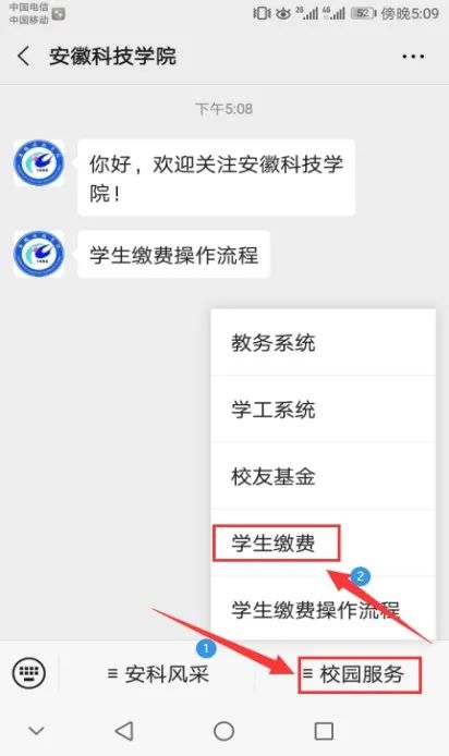 1.点击“安徽科技学院微信公众号”界面右下角“学生缴费”菜单。