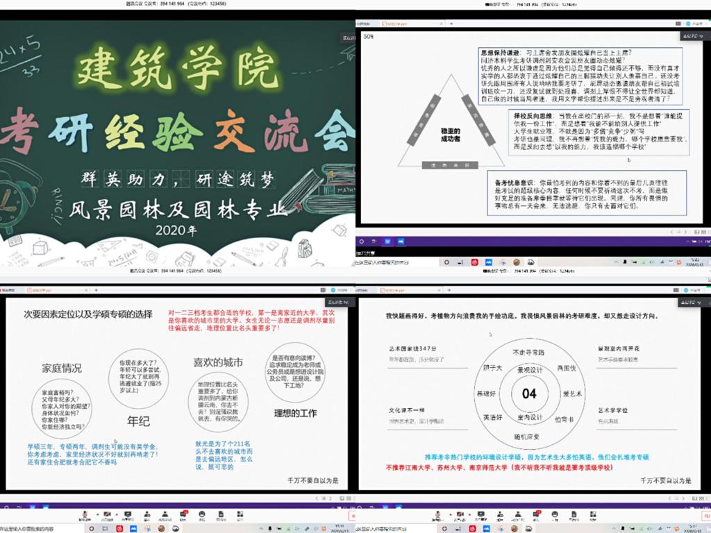 为在疫情防控阶段更好地服务2021届考研学子,6月13日至14日,建筑学院通过腾讯会议,分专业组织开展了四场“群英助力,研途筑梦”线上考研经验交流会,会议邀请考取中央美术学院、中国矿业大学、南京工业大学、大连理工大学、合肥工业大学、西南大学等高校共计17名2020届优秀党员代表、团员代表向同学们进行了考研经验分享和在线答疑,建筑学院辅导员以及来自不同年级不同专业814人次学生参会。