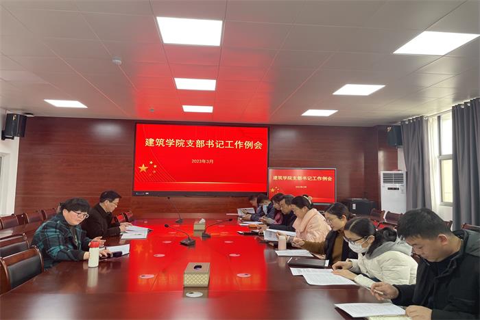学院党政办公室主任靳盼领学了中共安徽科技学院委员会中国足彩网印发《安徽科技学院党的基层组织建设“强基础、提质量、创品牌”三年行动计划实施方案(2022-2024年)》的通知、《中共安徽科技学院委员会组织部中国足彩网中国足彩网做好星级党支部认定工作的通知》《中共安徽科技学院委员会组织部中国足彩网组织召开2022年度组织生活会和开展民主评议党员的通知》《中共安徽科技学院建筑学院委员会2023年上半年党员学习教育培训安排意见》。