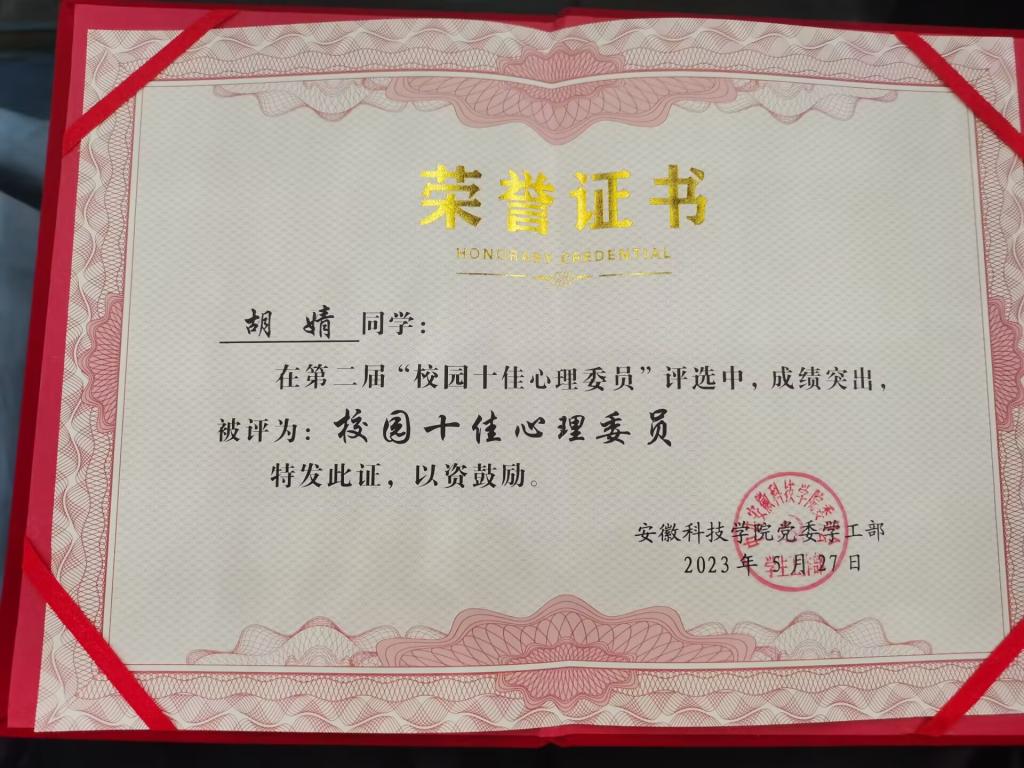 建筑学院胡婧同学荣获校园“十佳心理委员”称号