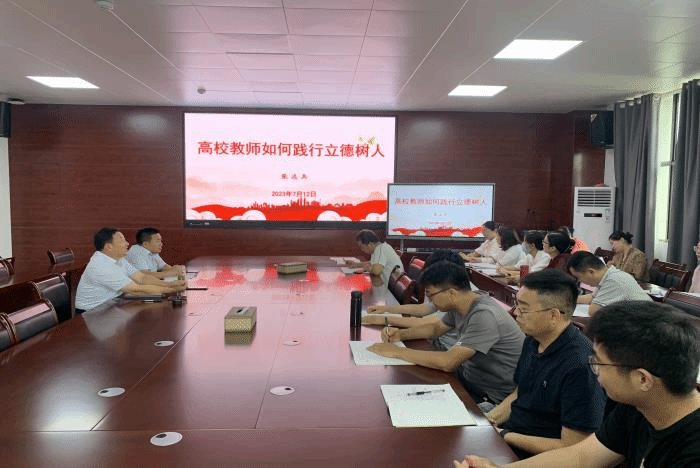 7月12日,院长张远兵以《高校教师如何践行立德树人》为主题,为学院教研室主任、实验室主任讲授专题党课。他从习近平总书记中国足彩网教育的重要论述、学院教师先进典型、违反高校教师职业行为准则案例、新时代高校教师职业行为十项准则等方面,明确教师在高校落实立德树人根本任务中的角色和使命,进一步加强师德师风建设。张远兵提到,要把立德树人贯穿到教育的各个环节中,担负起教师的责任与义务,将习近平新时代中国特色社会主义思想融入到教育教学中,努力成为业务精湛、学生喜爱的高素质教师。教师作为知识的传授者、价值观的塑造者、人类文明的传承者,肩负着立德树人的重要责任。在未来的工作中,教研室主任、实验室主任要率先严于律己,敬业爱生,向先进典型教师学习,争做“四有好老师”。