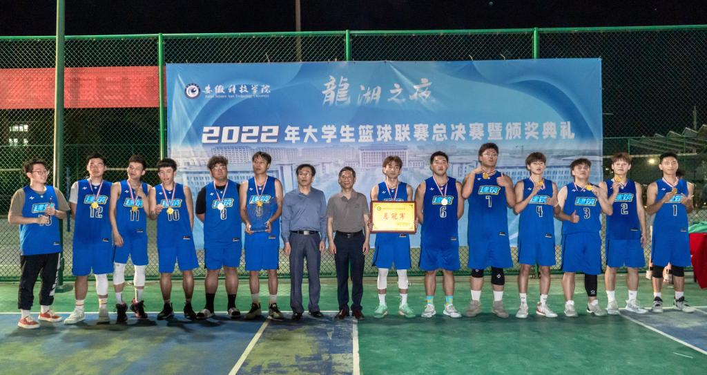 安徽科技学院2022年大学生篮球联赛总决赛于5月24日晚7点在龙湖校区篮球场正式举行,总决赛双方为建筑学院男子篮球队对阵机械工程学院男子篮球队,经过激烈比拼,建筑学院勇夺2022年校大学生篮球联赛总冠军。