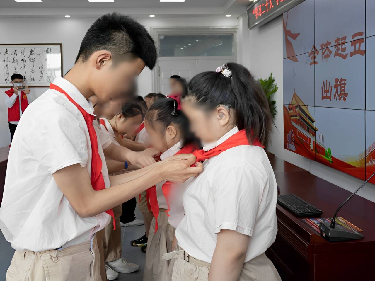 高年级的少先队员们,他们从懵懂的新队员慢慢成长,如今以他们的责任与担当,将新队员拉进到了少先队这个温暖的大集体中。童心向党,薪火相传,新老队员互敬队礼。在这一刻,孩子们眼神坚定,有力的小手举过头顶,庄严地献上了自己的第一个队礼,传递着少先队员的使命和责任。这个特殊而又神圣的时刻将永远铭刻在孩子们的心中,激励他们坚定地走好接下来的每一步,为胸前的红领巾增光添彩