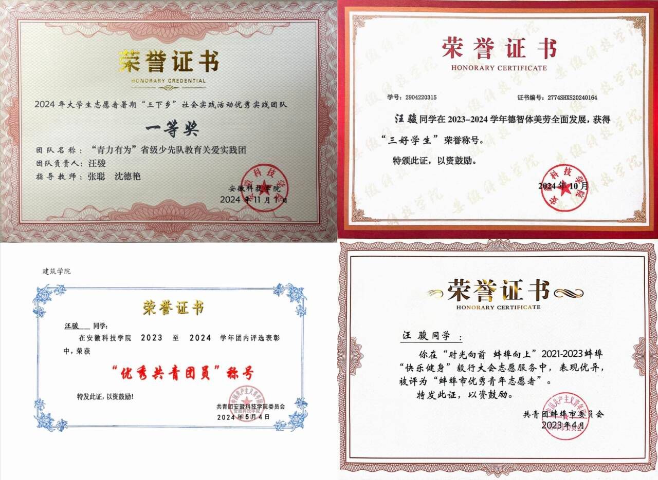大学期间,他积极参加竞赛活动,不断提高自己的专业技能,他曾获“三好学生”、“优秀共青团员”等称号、中国建设教育协会第十五届全国高等院校学生“斯维尔杯”BIM-CIM创新大赛-个人赛(二期)-BIM建模(土建)赛项一等奖、第十七届“高教杯”全国大学生先进成图技术与产品信息建模创新大赛建筑类团体二等奖以及建筑类先进成图技术赛道三等奖、2024年第四届“中望杯”工业软件大赛-全国总决赛建筑类专业赛道二等奖等。