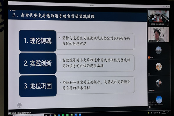 5月25日下午,应马克思主义学院邀请,上海师范大学马克思主义学院院长、博士生导师张志丹教授为我校马克思主义学院做题为“新时代坚定对党的领导的自信的阐释与建构”线上学术报告。此次报告为马克思主义学院本学期开展“21世纪马克思主义大讲堂”活动第一讲,学院全体教师在凤阳校区马院学术交流中心参加本次报告,部分兄弟高校思政课教师、我校兼职思政课教师、党务工作者、辅导员和部分研究生在线上同步参与聆听。马克思主义学院院长张德化主持报告会并致欢迎词。