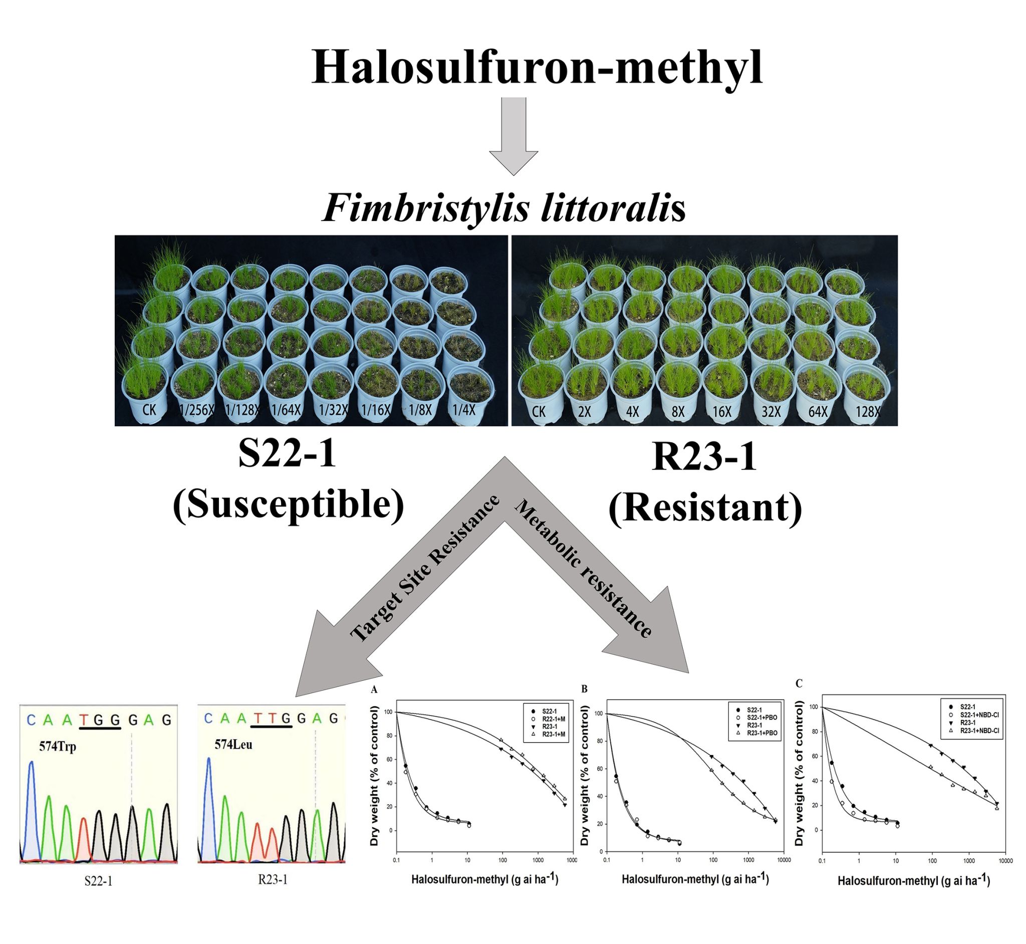 近日,我校农学院毕亚玲教授团队在国际知名期刊《Pesticide Biochemistry and Physiology》(中国科学院一区Top期刊,IF=4.2)发表了题为“The Trp-574-Leu mutations together with enhanced metabolism contribute to cross-resistance to ALS inhibiting herbicides inFimbristylis littoralis”的研究论文。该研究首次揭示了稻田恶性杂草水虱草(Fimbristylis littoralis Gaudich.)对乙酰乳酸合成酶(ALS)抑制剂类除草剂的抗性机制。硕士研究生史悦悦和青年教师吴志文博士为共同第一作者,毕亚玲教授为通讯作者,安徽科技学院为唯一完成单位。