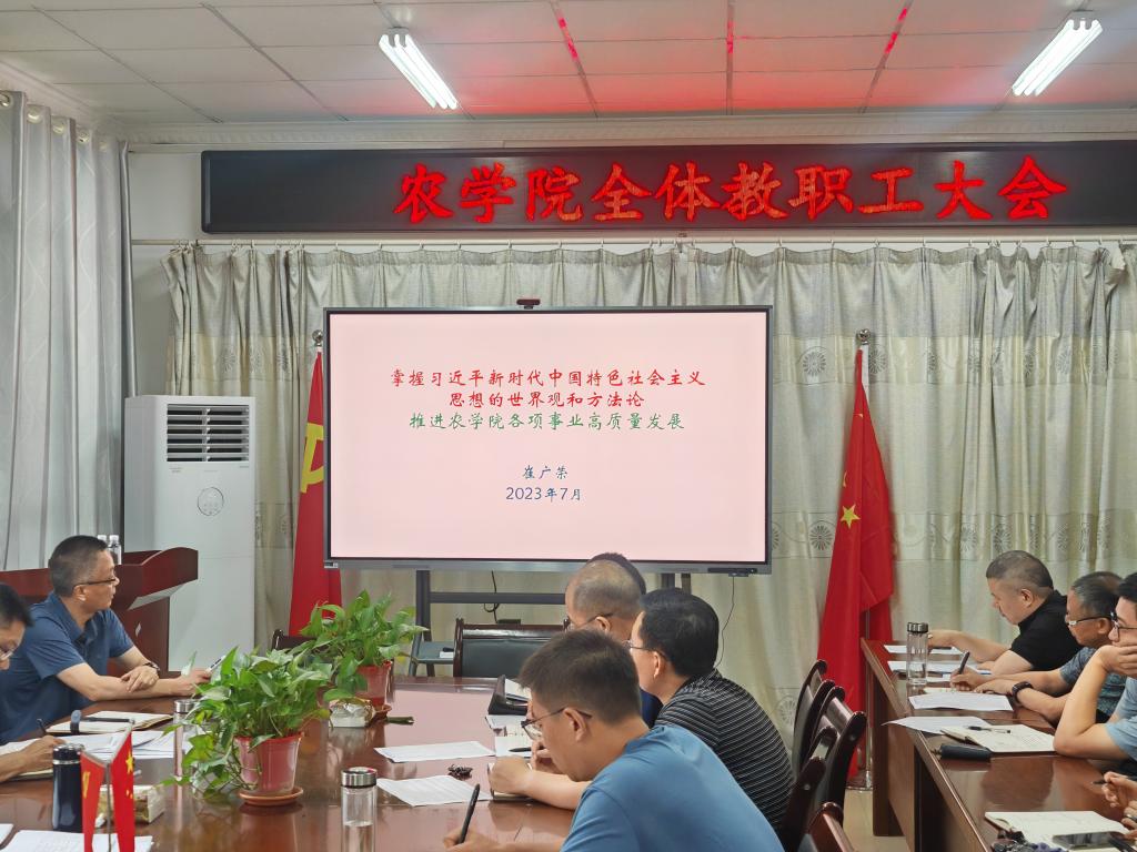 7月14日上午,农学院在学院会议室召开全体教职工大会,总结本学期各项工作开展情况,部署安排暑期重点工作,推进2023年度学院目标任务向前发展。学院主要党政领导及全体教职工参加会议。会议由党委书记何世潮主持。