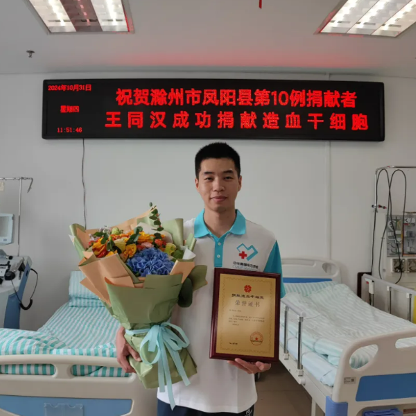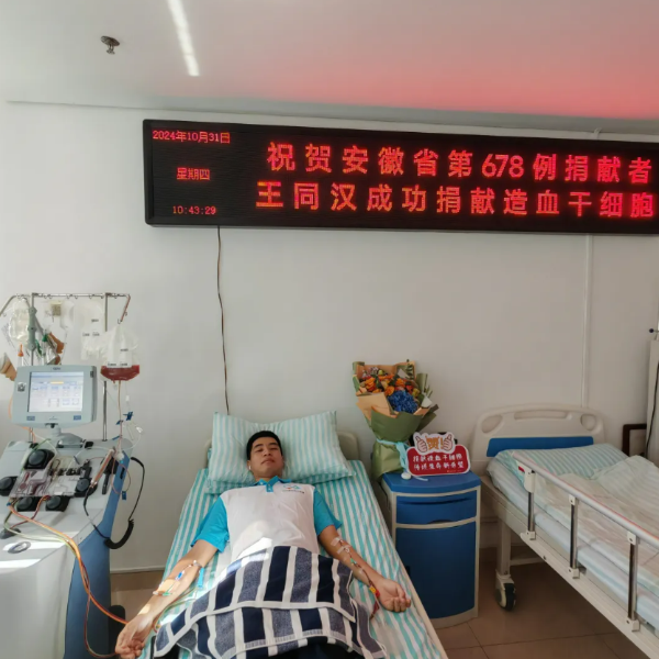 10月31日,安徽科技学院农学院2023级研究生王同汉在安徽省立医院成功完成造血干细胞捐献,为远方一名白血病患者送去了新生的希望。