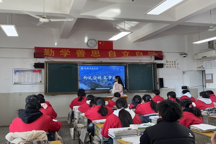到母校后,团队成员首先拜访了高中班主任并进行了交流,向老师分享了自己在安科的收获与成长。在老师的带领下,团队成员来到高三部分班级开展宣讲活动。结合ppt向学习学妹们概述了安科的历史底蕴、发展前景、学科专业和校园生活等方面的基本情况,让学弟学妹们对安科有了基本的认识。班主任补充阐述了凤阳的历史并介绍了凤阳的花鼓戏,激发了学弟学妹们的兴趣。在提问环节,团队成员积极解答学弟学妹们的问题和困惑,与他们进行交流互动,深化他们对安科的了解,增强他们对安科的向往之情。团队成员还分别分享了自己在高中的学习经验和大学校园生活,并鼓励母校的学弟学妹们勇敢追求自己的梦想,树立清晰的目标,并为之努力学习。