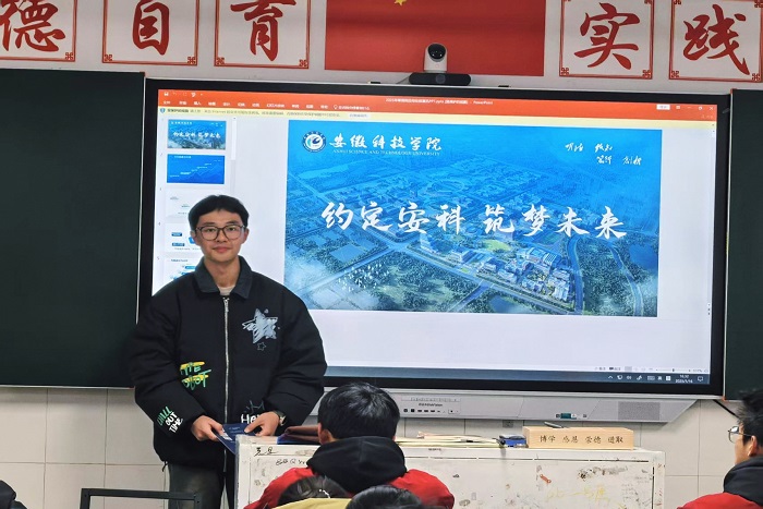 活动当天,凌天羽在高中班主任老师的热情引领下,走进了熟悉的校园和教室。面对学弟学妹们那一张张充满朝气和期待的脸庞,凌天羽首先表达了对母校的感激之情,回忆了自己在高中时期的美好时光以及老师的辛勤付出和悉心教导。随后,他从安徽科技学院的悠久历史、雄厚师资、丰富的学科专业、优美的校园环境以及广阔的发展前景等多个方面,向学弟学妹们进行了详细而生动的介绍,让大家对安徽科技学院有了更全面、更深入的了解。凌天羽还结合自己在大学里的学习和生活经历,与学弟学妹们分享了自己的成长与收获,鼓励他们在高中阶段要努力学习,树立明确的目标,珍惜时光,为自己的梦想而奋斗。他特别提到了安徽科技学院注重实践教学和培养学生创新能力的特色,以及丰富多彩的校园文化活动,这些都为学生的全面发展提供了广阔的平台。在互动交流环节,学弟学妹们积极踊跃地提问,问题涵盖了专业选择、学习方法、大学生活等各个方面,凌天羽都一一耐心解答,现场气氛热烈而融洽。