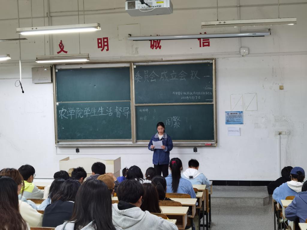 为引导和督促广大同学自觉遵守学校学生管理相关规定,树立大学生文明形象,推进校园文明建设,4月17日,农学院召开学生生活督导委员会成立会。会议由学生生活督导委员会全体成员及各班级生活委员参加。