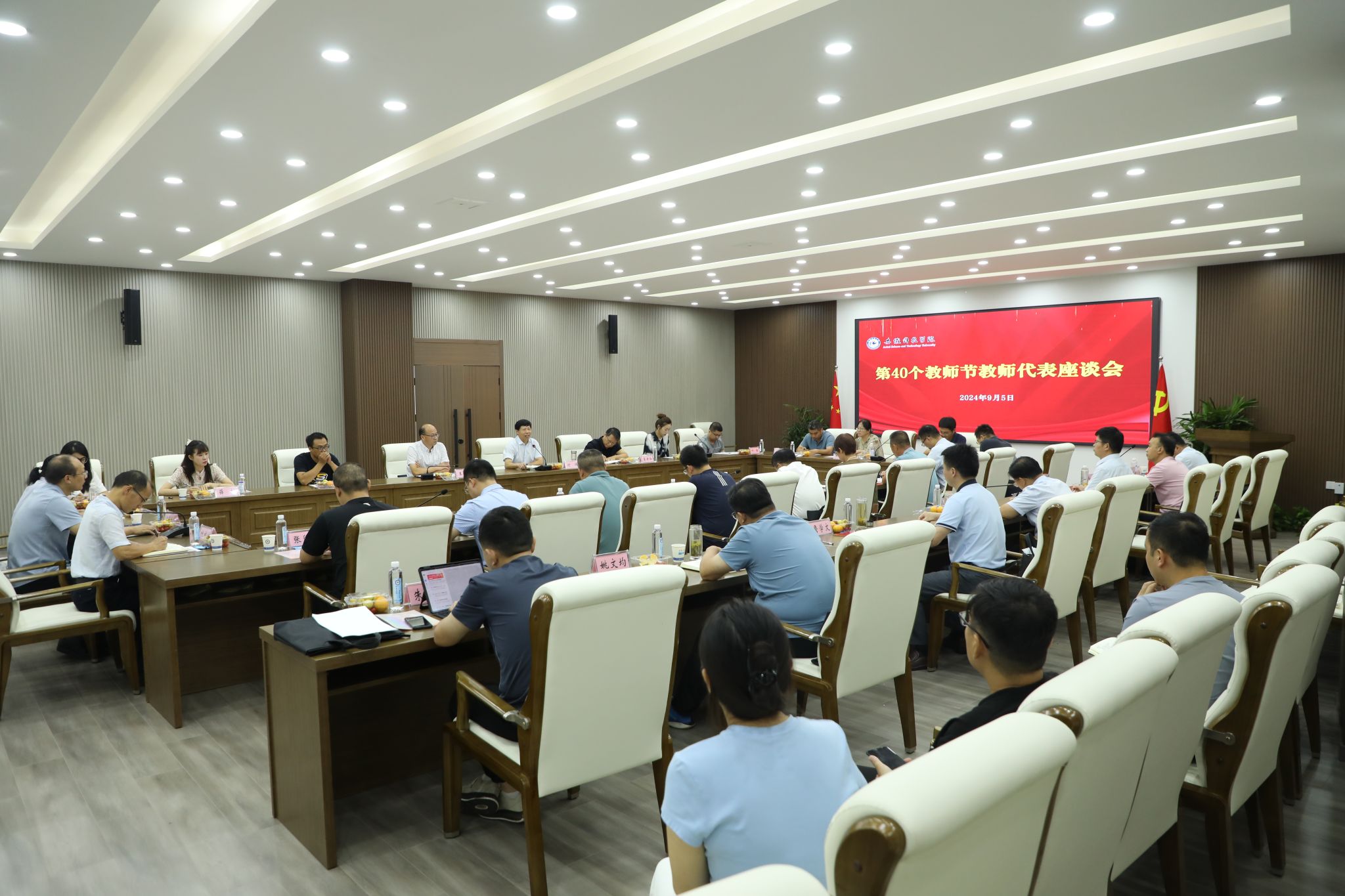 9月5日上午,第40个教师节教师代表座谈会在凤阳校区图书馆B座多功能厅举行。校党委书记时伟,党委委员、副院长李升和,党委委员、副院长王孝义出席座谈会,来自全校各教学单位的20名优秀教师代表参加座谈会。座谈会由王孝义主持。