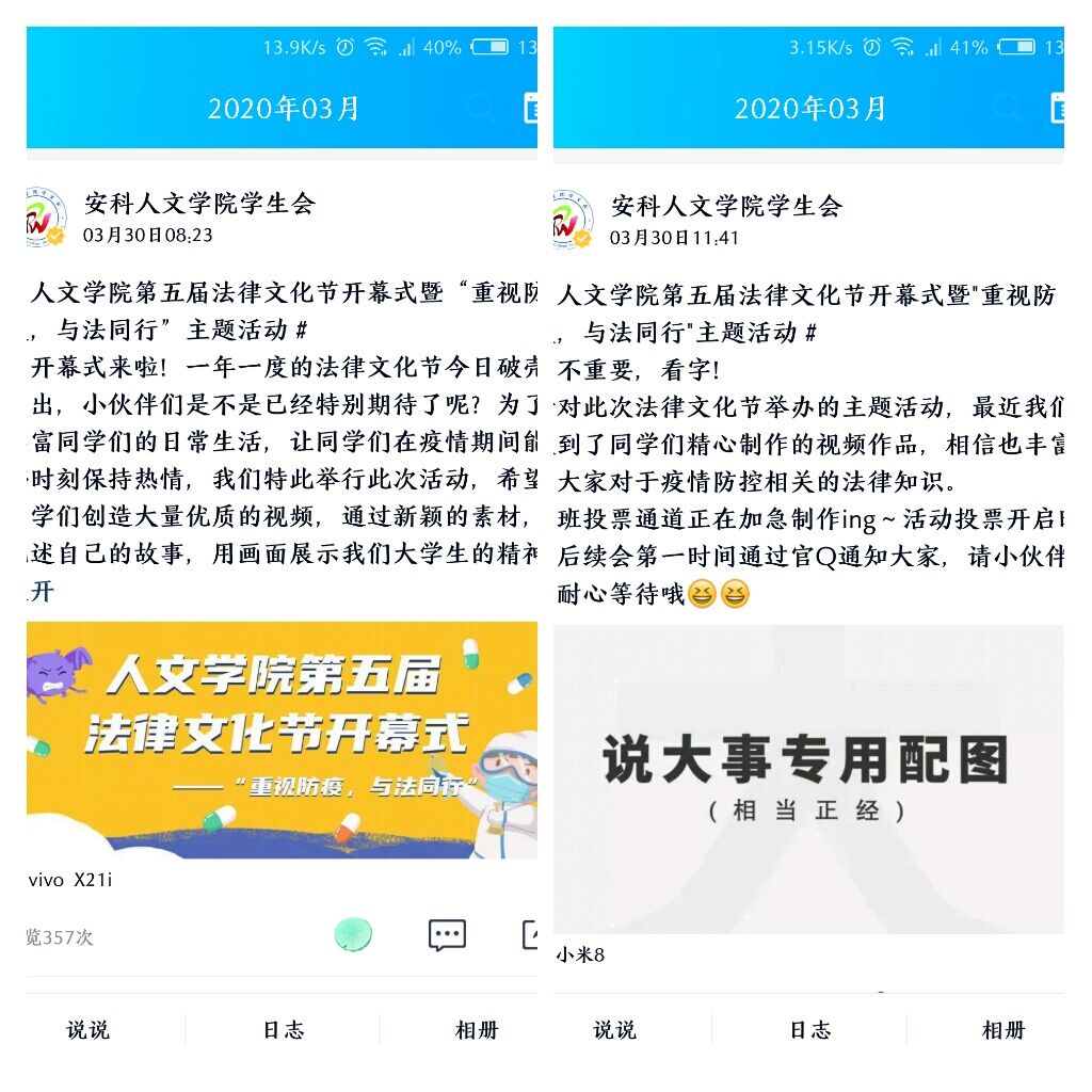 活动以“重视防疫 与法同行”为主题,通过人文学院学生会官方QQ发布动态进行宣传,向学生们广泛征集有关防控疫情的优质视频作品,鼓励学生们通过新颖的素材记述自己与疫情的故事,分享自身感受,传递正能量,展现青年大学生的精神风貌。活动期间,学生们积极踊跃参与,人文学院收到了大量有趣、新颖、幽默的学生作品,学生们纷纷用自己独特的方式记录下了这段特殊而又值得铭记的时光,极大的丰富了活动意义。经过人文学院分团委及学生会的严格审核,筛选出了部分优秀视频投放于易班工作站,以供学生们进行最终投票评选。