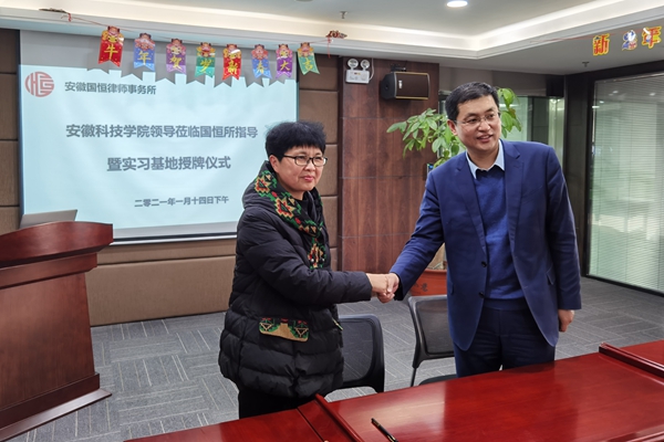 人文学院一行分别参观了安徽国恒律师事务所、安徽徽商律师事务所。与安徽国恒律师事务所签署了校外实习实训基地协议和就业基地协议,授予“安徽科技学院实习实训基地”标牌,并向两位资深律师颁发了特聘教授聘书。双方在总结前期合作的经验做法基础上,就后续深化合作的具体事宜进行了广泛交流,达成了多项富有建设性的创新合作意向。