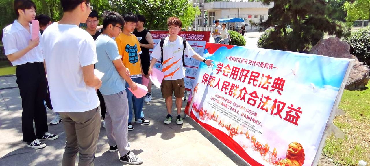 法学学生党支部于西区小广场展出民法典知识展报。活动中,法学学生党支部党员们利用展板向过往同学们宣传《中华人民共和国民法典》的相关知识,用通俗易懂的语言引导同学们了解《中华人民共和国民法典》、熟悉《中华人民共和国民法典》。同时,他们还耐心解答了同学们对于《中华人民共和国民法典》相关内容的询问,积极促进《中华人民共和国民法典》深入人心。
