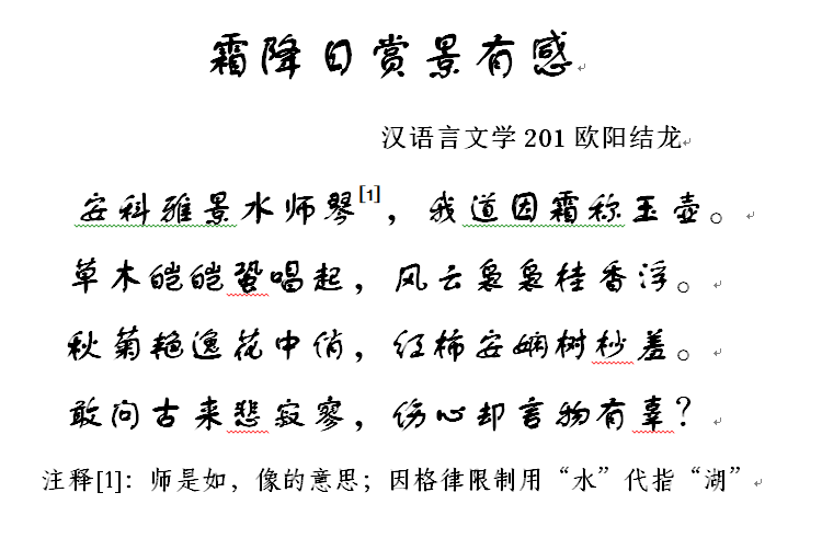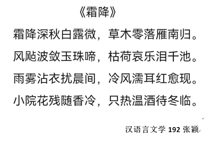 为进一步弘扬中华民族优秀传统文化,让二十四节气的文化浸润学生的人生,启迪学生的智慧,增强学生对传统节气的了解,人文学院于10月13日至20日开展了二十四节气之“霜降”原创诗歌作品征集活动。