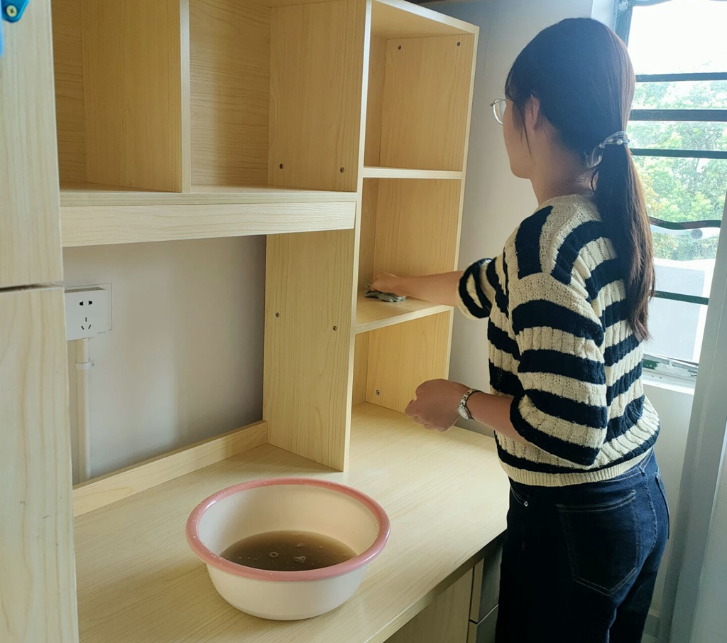 同学们根据安排,分别前往东一、东六、东二三栋新生寝室楼,对桌椅地板等进行了仔细的清扫擦拭,同学们不怕脏、不怕累,以认真负责的态度打扫每一处,并对宿舍硬件设施进行了逐一检查。清扫工作结束后,志愿者们归还清扫用具,检查寝室情况,确保寝室干净整洁、没有杂物后,关闭门窗,将寝室门上锁,确保寝室安全后有序离场。