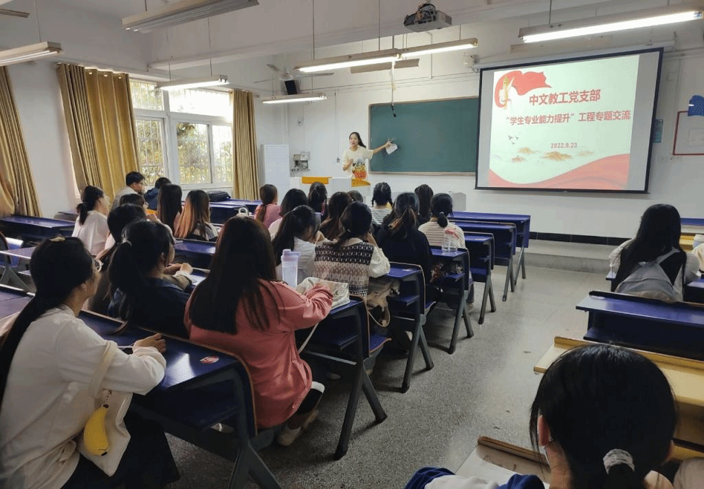 2022年9月23日上午,中文教工党支部组织的“学生专业能力提升”工程专题交流会在求知楼B207举行。此次交流会以分享普通话与教师资格证考试经验为主要内容,邀请了2019级汉语言文学汤佳慧、胡涛两位同学,2020级汉语言文学专业学生参加交流会。