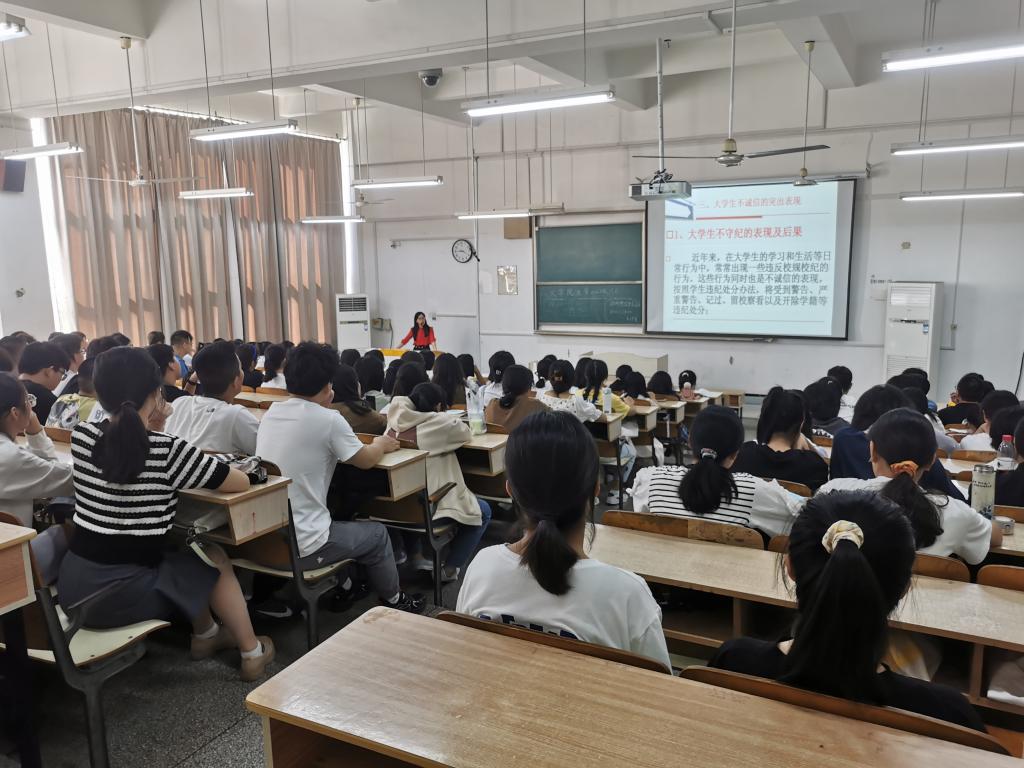 鲁冰冰讲述了诚信的含义与重要性,列举了少数大学生不守纪、不守法、不守信的突出表现及严重后果。她指出,大学生在生活方面应当遵规守纪、自尊自爱;在学习方面应当遵守课堂秩序,创建良好学风;在学术、资助、求职就业方面应该诚实守信。她带领全体新生学习了《安徽科技学院学生日常行为规范》,讲述了大学生校园礼仪的重要性,在宿舍群体生活礼仪、校园课堂礼仪、师生交往礼仪、参加校园集体活动礼仪等方面提出了具体要求,认真回答了同学们就学习生活方面提出的具体问题,帮助新生更好的完成“大学生”身份的转变。
