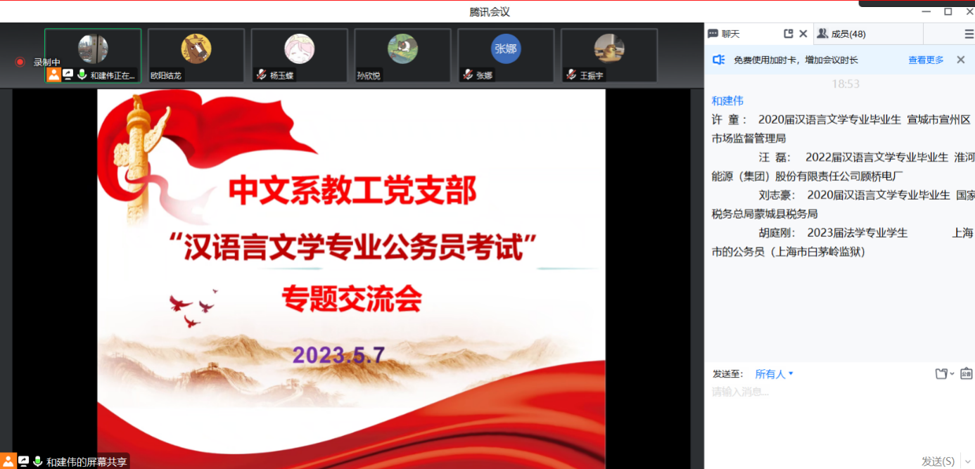 5月12日晚,人文学院中文系教工党支部举办“汉语言文学专业公务员考试”线上专题交流会,邀请许童、刘志豪、汪磊、胡庭刚四位毕业生,为汉语言文学专业2020级、2021级同学介绍考公、就业等方面的经验。交流会由和建伟主持。