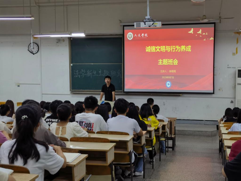 为强化诚信文明教育,注重健全人格培养,弘扬诚信文化,提升学生的诚信品质和社会责任感,人文学院于新生开学期间开展诚信文明与行为养成主题教育讲座。辅导员徐琦琦主讲,2023级全体新生参加。