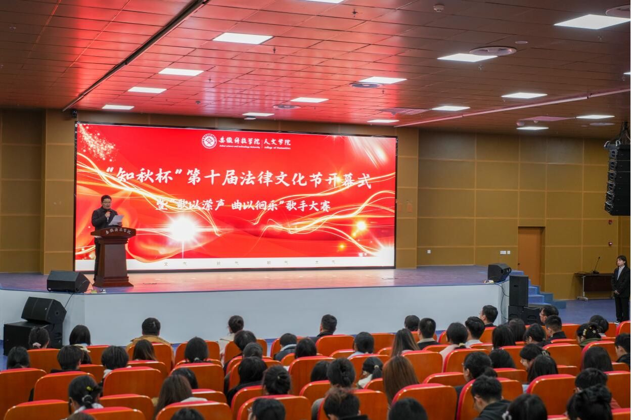 为大力弘扬法治精神,培育大学生法治观念,丰富校园文化生活,展现青春学子的时代面貌,3月15日下午,人文学院在图书馆二楼报告厅举办“知秋杯”第十届法律文化节开幕式暨“歌以潆声,曲以徊乐”歌手大赛。安徽知秋律师事务所主任、首席合伙人宫鉴,执行主任、高级合伙人耿晓兵,滁州市南谯区团委书记徐迟,人文学院党政领导、教师和辅导员代表出席开幕式。