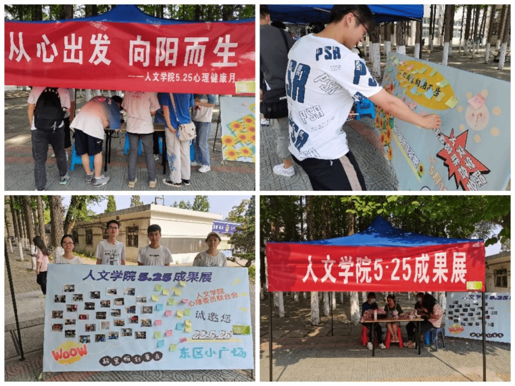 5月25日,人文学院“5?25心理健康月成果展”在东区小广场举行,展板上丰富多彩的照片展示了人文学院心理健康月系列活动的成果,见证了人文学院心联成员的付出与努力。本次活动的圆满举办,创新了心理健康教育形式,普及了心理健康知识,在全校营造了关注心理健康、懂得心理健康、重视心理健康的浓厚氛围。(特约通讯员:鲁冰冰 审核:李沙娜)