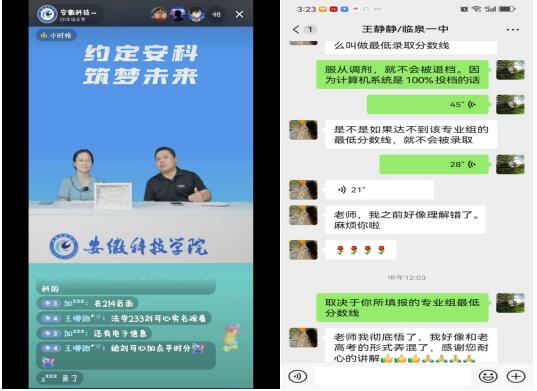 在招生与就业工作处的指导与支持下,中文系主任苏兆龙、法学系副主任田野,通过安徽科技学院抖音平台积极参与在线直播互动,向广大考生介绍法学和汉语言文学专业人才培养目标、师资队伍、教学资源保障、人才培养质量和就业升学等情况,以及《中国法制史》历史剧策划展演、法学读书会等特色活动,积极争取优质生源报考本专业。同时,学院通过微信公众号介绍师资队伍、招生专业、办学水平、毕业生就业与考研等情况,展示优美宜人的学习环境、丰富多彩的文体活动及大学生创新创业成果等,并通过全体师生微信朋友圈广为推送转发。