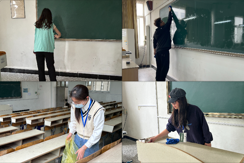 活动期间,同学们身穿志愿者马甲,携带清扫工具,分为清扫组与排查组,前往求知楼和新知楼清扫教室卫生,清理座位底下等卫生死角及各种垃圾。在大家的共同努力下,教室再次窗明几净,地面干净整洁,整体环境焕然一新。
