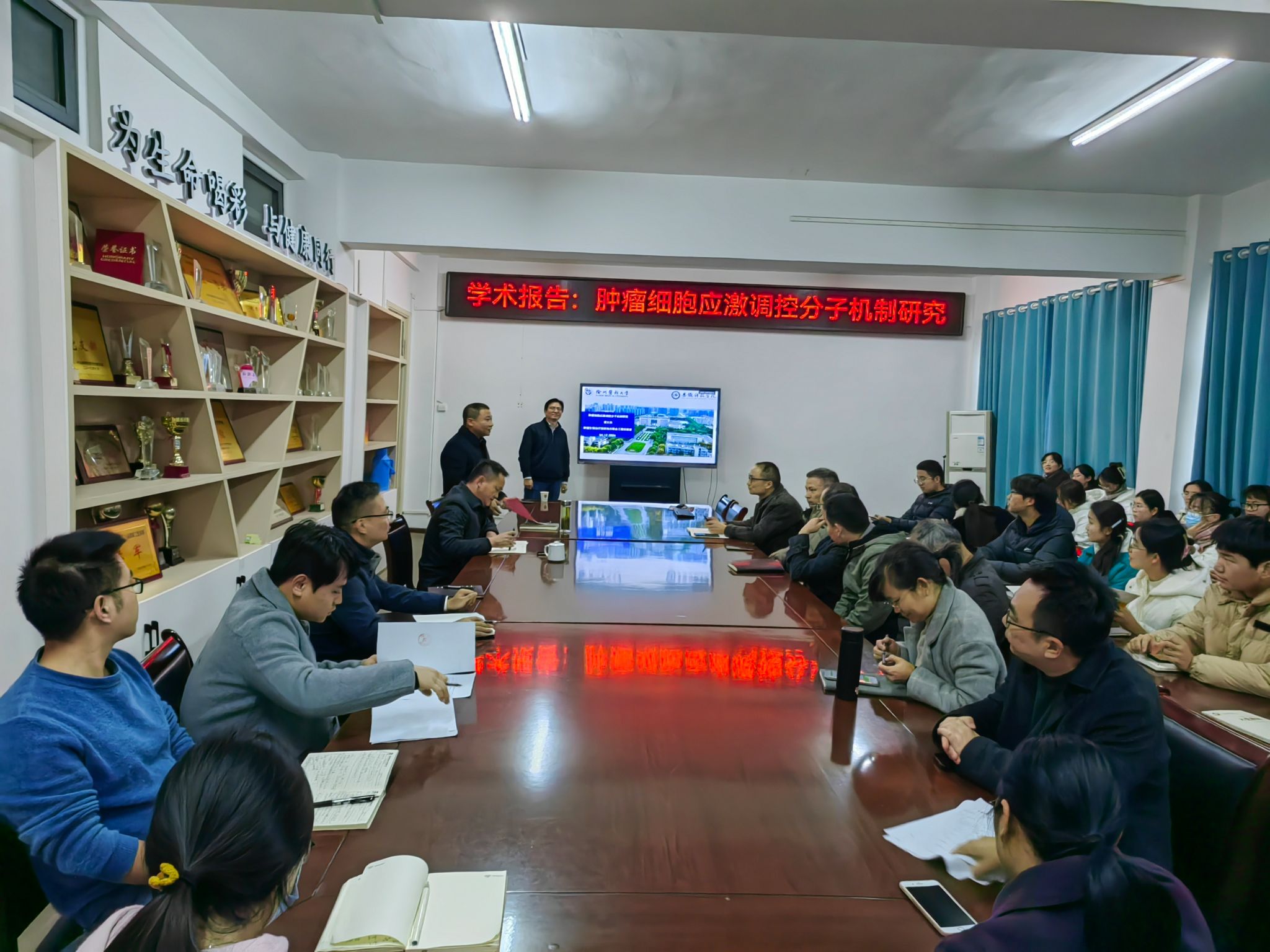 葛文杰教授以肿瘤细胞应激调控分子机制研究为主题,结合自身科研实践和有关研究成果,重点从肿瘤细胞的应激反应、骨架重塑、信号转导以及MiR-80的功能解析等,深入浅出地讲解了肿瘤细胞应激调控分子机制,并对国家自然科学基金申报作了专题辅导。在报告中,葛文杰教授表达了对母校的深厚情感以及对母校事业发展的热切关注,并指导、激励学弟学妹们坚定理想信念,科学做好学业和职业发展规划,勤于学习、勇于实践、敢于创新,全面提升个人综合素养和核心竞争力。